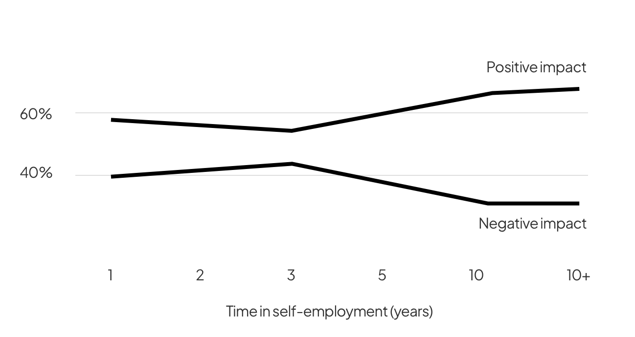 However, new freelancers are more likely to report both more significant improvements and declines in their mental health as a result of self-employment - compared to established freelancers, showing a polarised picture. This indicates a wider spread of experiences among new freelancers, rather than a consistent positive effect.